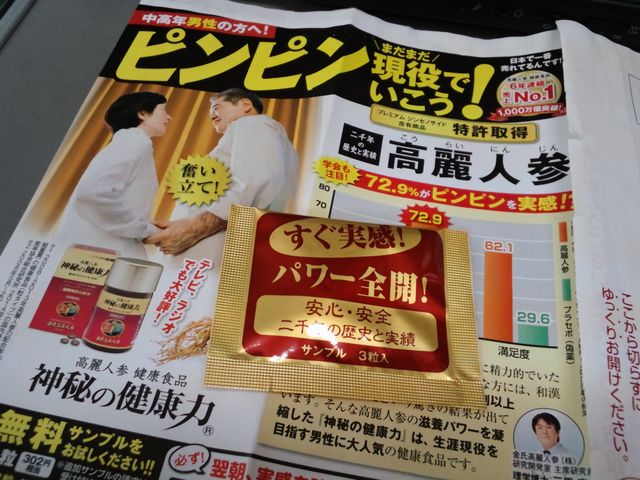 こんなサンプル商品がポストに入っていました。これさえ飲めば、朝からピンピン!になるそうで・・・。