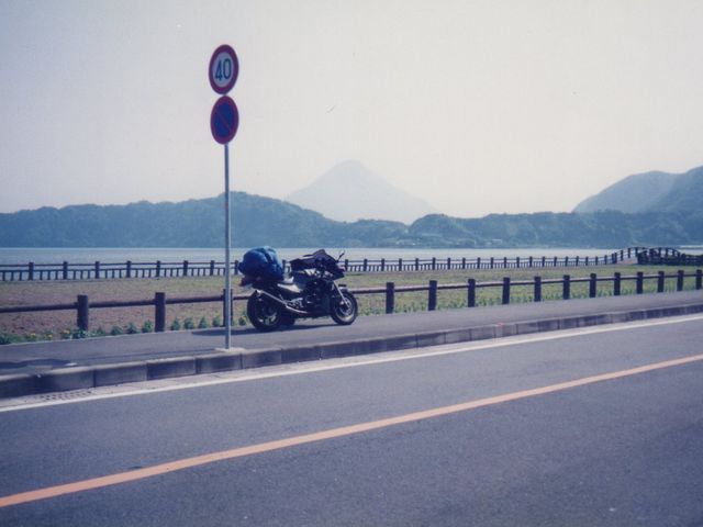 セピア色の写真は、九州は鹿児島県。うっすらと見えるのは開聞岳。荷物満載のバイクはGPZ900R。あ~旅に行きたいなぁ(笑)
