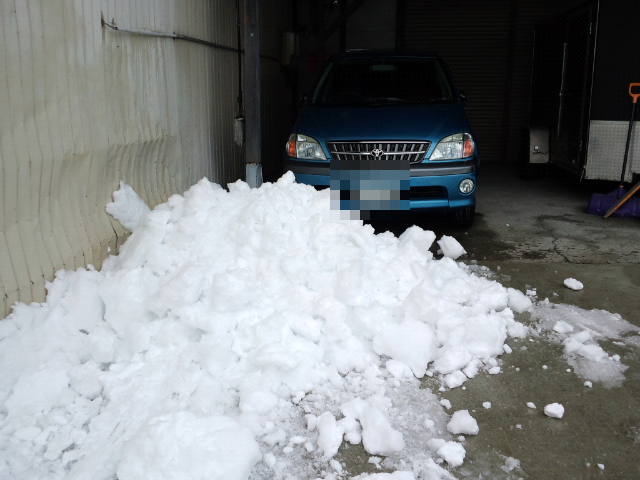 ※屋根の雪が崩落すると、車の出入りが出来なくなる作業場。雪国として、建物の造りが間違ってるんじゃないのか?