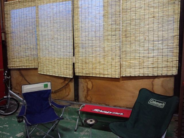 喫煙スペースが日差し直撃で暑くなっていたので、簾を買いました。そこに運悪く遊びに来られたOさん、簾を取り付けする羽目に(笑)