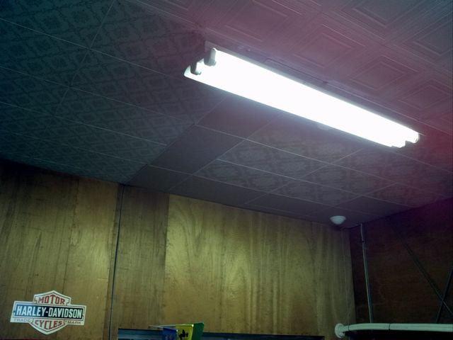 写真では判りにくいですが、事務所の蛍光灯が天井から外れています。現在、配線一本で何とか釣り下がってる状態・・・。