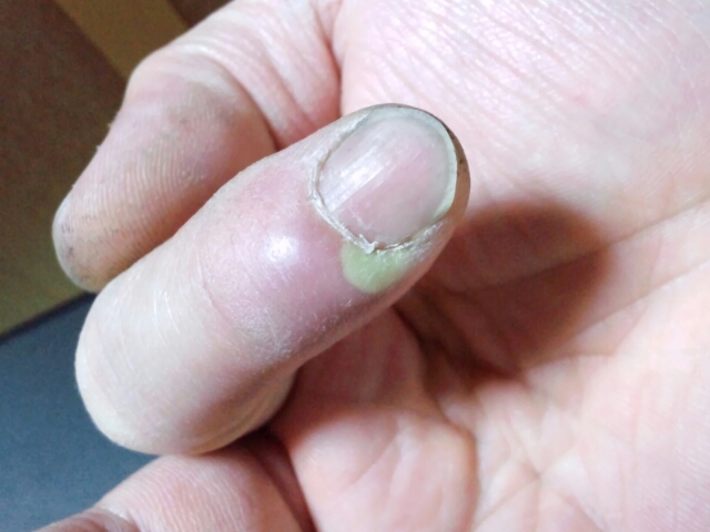 汚ない手のアップ写真ですみません。1日で治るはずだった指ですが、さらに腫れて、しかも膿んできました・・・。