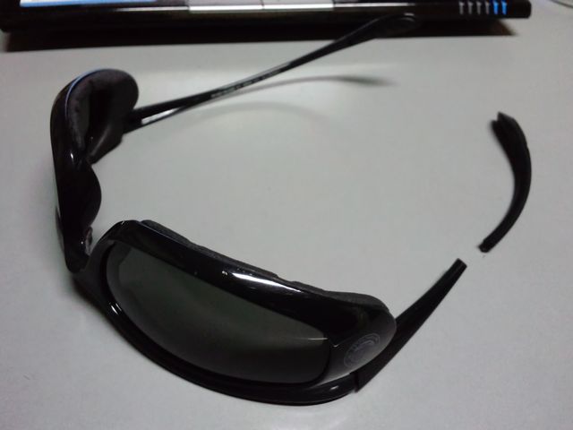 ハーレーのサングラスだし、なんか勿体無い。強力アロンアルファ?いや、半田で溶かしてくっつける?(どちらも無理な感じ)