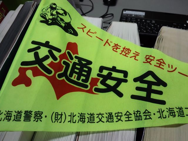 北海道弾丸ツーリングチームも(おそらく)全員無事に戻って来ていると思われ・・・。お土産に交通安全の旗を頂きました。