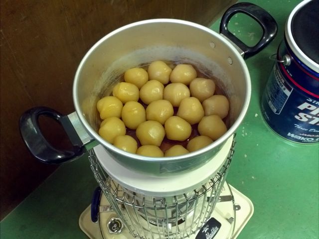 こんな寒い時は、アラジンストーブの上で、玉こんにゃく。なかなか食欲をそそる匂いを発しています。