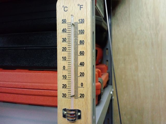 摂氏と華氏(必要無い?)表示の某100均製。これで、作業場の正確な温度が判るようになったのですが・・・。